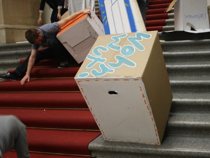 Auf der großen Treppe, direkt zwischen dem Stand des Jugend-Demokratiefonds und dem Empfangstresen des wannseeFORUMs, das wieder die Koordination des Events stemmt, liegen, robben, tanzen und fallen die Schauspielerinnen und Schauspieler. Manchmal nimmt man sie kaum wahr, weil sie stillstehen. Im nächsten Moment geht ein Geschrei und Getöse los, das aufrüttelt. Und wenn niemand zuhört, besetzen sie einfach unsere Video-Box, mit der wir an diesem Tag jugendliche Meinungen einfangen wollten. Das hat dann auch geklappt - dazu später mehr!