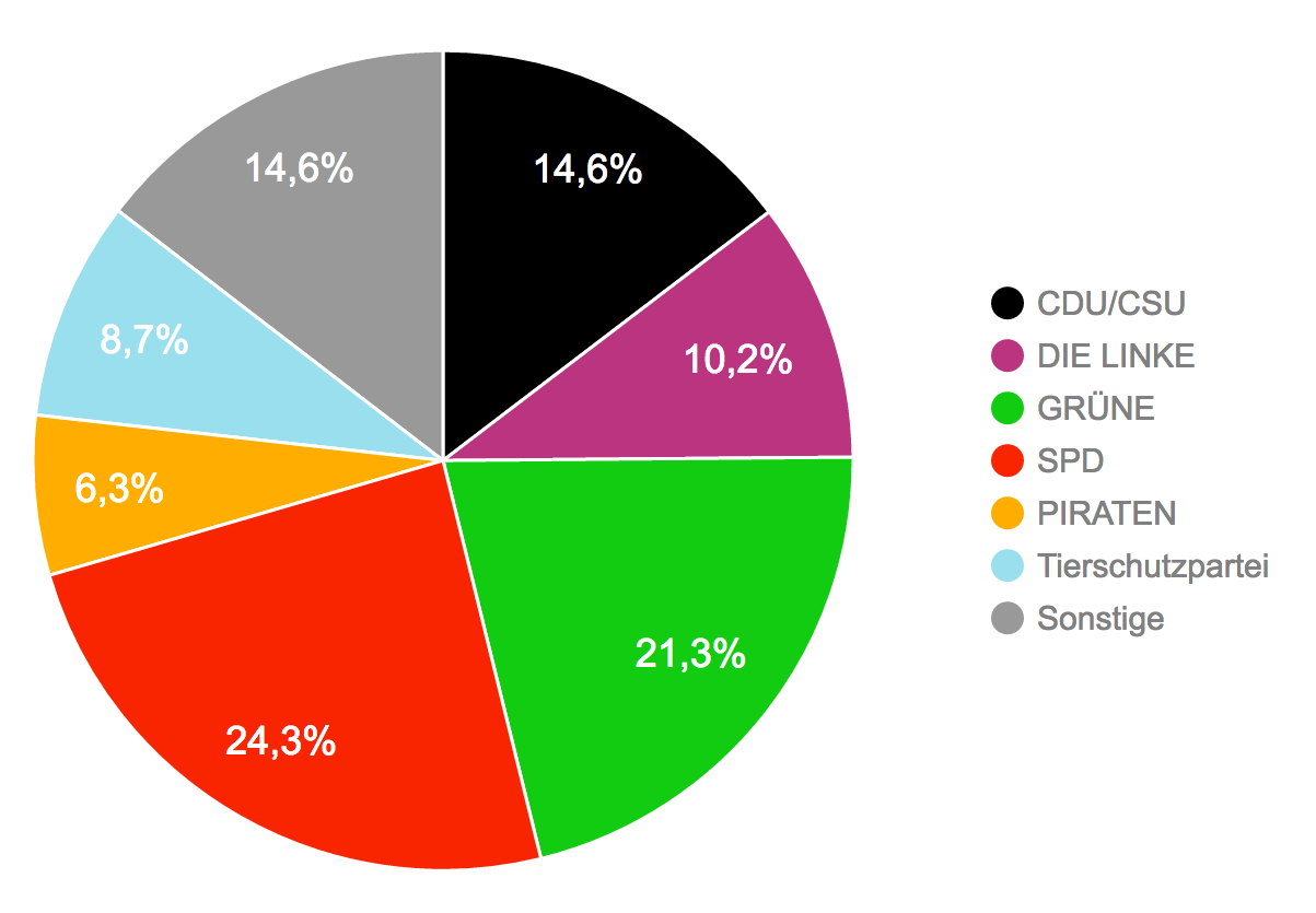 Die SPD würde stärkste Kraft, gefolgt von den Grünen, der CDU und der Linken. Traditionell beliebt bei Kindern und Jugendlichen ist die Tierschutzpartei, die mit 8,7 Prozent im Abgeordnetenhaus vertreten wäre und auch die Piraten würden als sechste Fraktion in das Landesparlament einziehen.