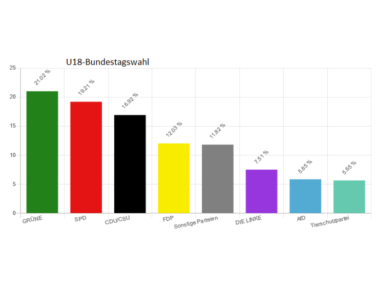 Im Rahmen der U18-Wahlsendung wurden um 18 Uhr im Livestream die Ergebnisse der U18-Wahlen bekannt gegeben und ausgewertet. Bei der U18-Bundestagswahl liegen insgesamt das BÜNDNIS 90/DIE GRÜNEN mit knapp 21% vorne, dicht gefolgt von der SPD mit 19.2%. Die CDU/CSU belegt den dritten und die FDP den vierten Platz. 11.8% der jungen Wähler*innen entschieden sich für sonstige Parteien, gefolgt von der LINKEN, der AfD und der Tierschutzpartei.