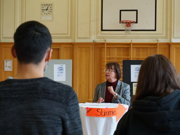 Staatssekretärin Sigrid Klebba der Berliner Senatsverwaltung für Bildung, Jugend und Familie besuchte das Wahllokal in der Willy-Brandt-Schule, beteiligte sich rege am Austausch und betonte die Rolle der politischen Bildung hinter den U18-Wahlen. „Der heutige Tag ist das Ende eines längeren Prozesses, sich auch damit [mit dem politischen Prozess selbst] auseinanderzusetzen: Was ist denn das, wie ist unsere Gesellschaft, wie ist die Verfasstheit dessen, wie funktioniert das alles miteinander - von der kommunal- bis hin zur Bundesebene -, wer hat was zu sagen, wer hat was zu entscheiden - und sich damit auszukennen“, so Staatssekretärin Klebba zu den Schüler*innen. „Die Stimmen der jungen Menschen bekommen mehr Gewicht und fließen ein in politische Entscheidungen, die auch in der kommenden Wahlperiode natürlich kontrovers diskutiert werden. Wenn Sie sich lautstark zu Wort melden, wird auf jeden Fall alles besser.“