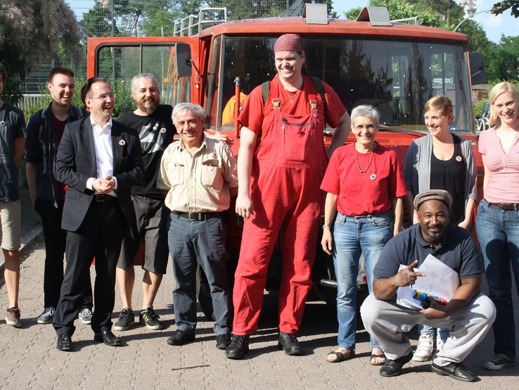 Mit einem alten Feuerwehrauto tourten am Freitag die DirektkandidatInnen aus Steglitz-Zehlendorf mit Jugendlichen durch ihren Kiez. Mit dabei waren Dr. Ute Finckh-Krämer (SPD), Nina Stahr (Grüne), Lampros Savvidis (Linke), Gerwald “Faxe” Claus-Brunner (Pirat) und Helmut Metzner (FDP).