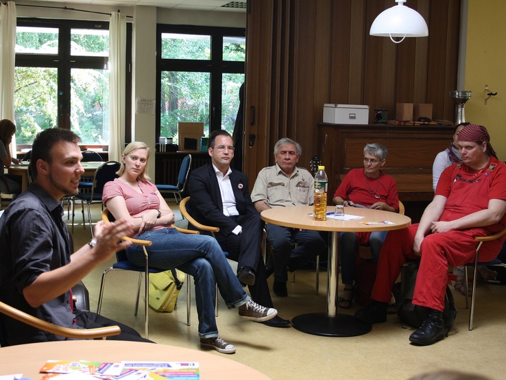 Die zweite Station war der "Bauwagen", ein von Jugendlichen teils selbstverwalteter Treffpunkt und Projekt des Nachbarschaftshaus Wannseebahn e.V. Auch hier wurden Anliegen der Jugendlichen vor Ort besprochen, zum Beispiel die Forderungen nach mehr Jugendthemen in der Politik, nach Instandhaltung von Fußballplatz und Einrichtung von Spraywänden im Kiez.